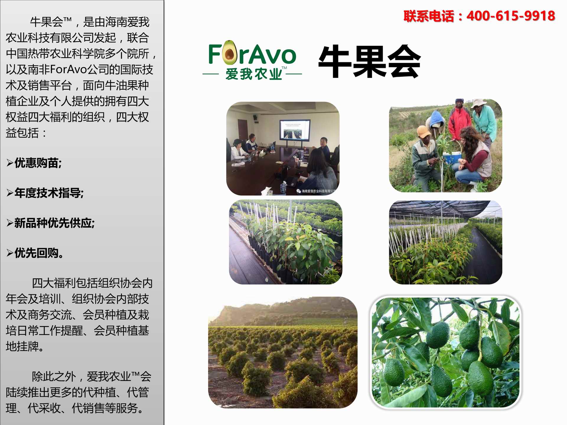 海南愛我農(nóng)業(yè)科技有限公司是一家綜合性的高科技農(nóng)業(yè)發(fā)展企業(yè),旗下愛我農(nóng)業(yè)TM致力于打造中國最大最強(qiáng)的牛油果種植企業(yè)。依托美國、南非、澳大利亞等擁有百年牛油果繁育、種植歷史以及產(chǎn)業(yè)鏈?zhǔn)袌龅膬?yōu)勢,開展牛油果種苗繁育、種植技術(shù),種植加盟、深加工等產(chǎn)業(yè)。結(jié)合中國市場,面向廣大苗圃基地、種植農(nóng)場、合作加工等企業(yè),推出的適合規(guī)?;?、標(biāo)準(zhǔn)化的牛油果全產(chǎn)業(yè)鏈服務(wù)。 Hainan Foravo Agricultural Technology Co., Ltd. is a comprehensive high-tech agricultural development enterprise , dedicated to building the largest and most powerful avocado plantation enterprise in China. Relying on the advantage of avocado nursery, planting history, and the industrial chain over 100 years in the United States, South Africa, Australia, we are carrying out nursery, planting, proce...